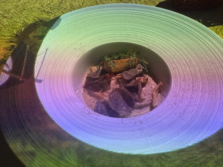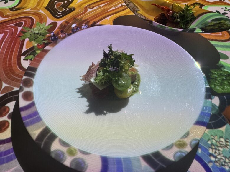 暗い会場ではあるけれど、その分、投影と料理が重なった写真はかなり雰囲気が出ます。普通のコース料理より“撮りたくなる瞬間”が多いです。