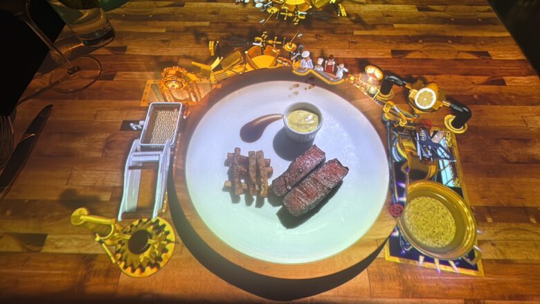 メインのフランスパートはステーキフリット。ここはかなりわかりやすく満足度が高いです。映像の中で料理が準備されていく流れから実際の皿につながるので、出てきた瞬間のテンションが上がる。