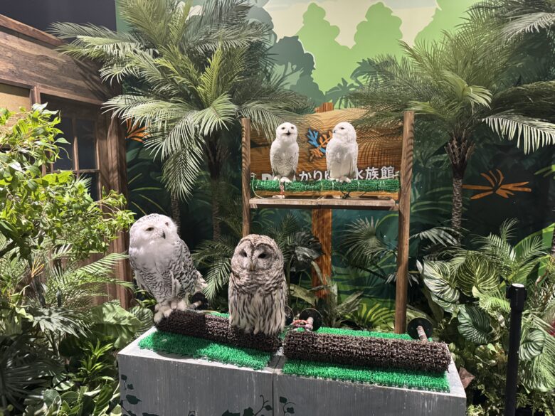 意外だったのが、ふくろうの展示コーナー。水族館なのに鳥類?と驚きましたが、ふくろうたちが静かに佇む姿はとても癒やされます。子どもは「かわいい!」と近寄り、大人はその鋭い瞳に見入ってしまいました。ふくろう展示は写真映えもするので、カメラ好きにも嬉しいポイントです。