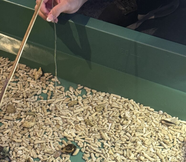水族館内のアトラクションのひとつ、「やどかり吊り」も要チェックです。料金は500円で、まさに“ワンコインで楽しめる体験”。やどかりを釣り上げて観察したり、持ち上げること自体が子どもにとって新鮮で大興奮でした。難しい操作はなく、幼児でも親と一緒に楽しめる気軽さが魅力です。