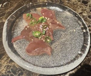 言われなかったら生肉にしか見えない。赤身っぽい色、薄切り、薬味のネギと胡麻。見た目だけなら完全に“刺し系”。