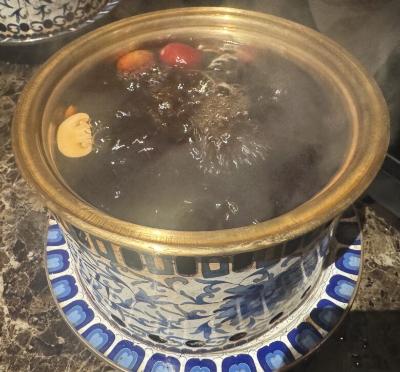 ぐつぐつと静かに煮える透明感のあるスープ。見た目はシンプルなのに、ひと口飲むと驚く。